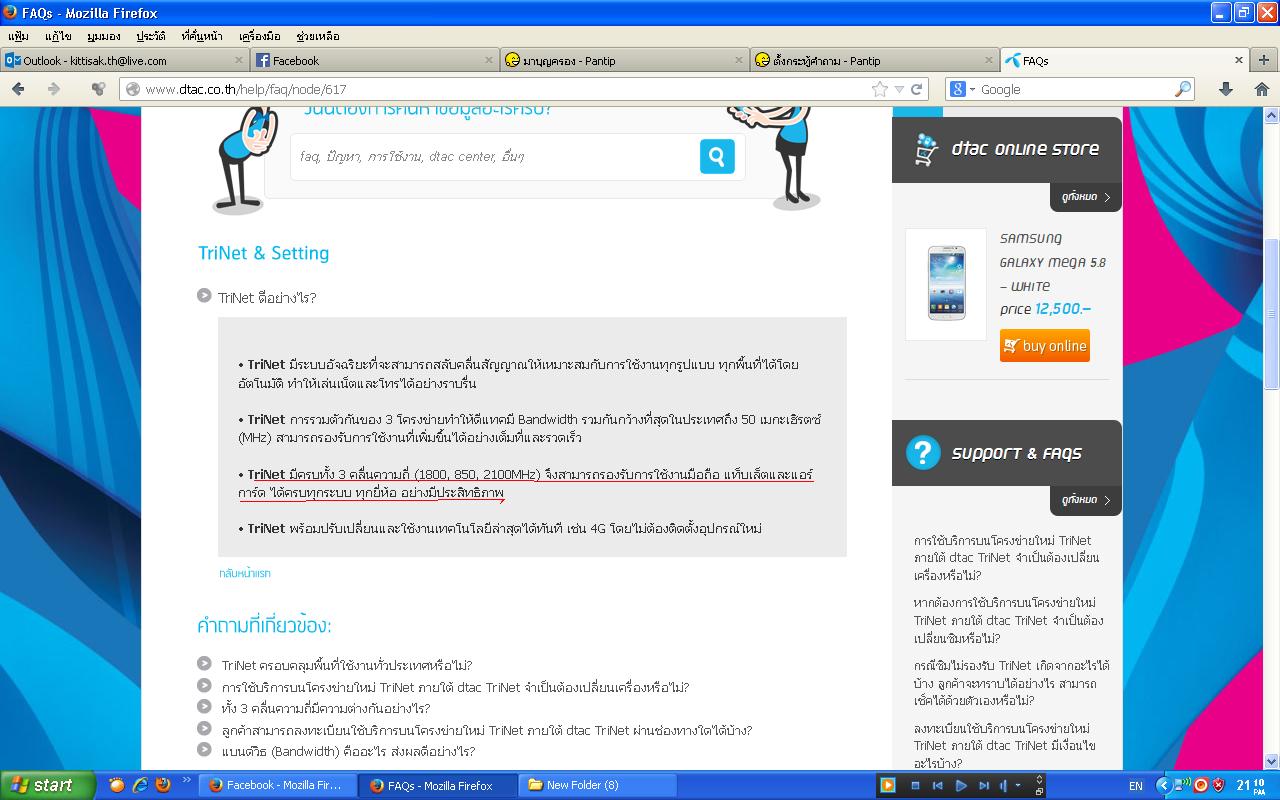 ตรงนี้ต้องขอบอกก่อนว่าเครื่องที่ผมใช้เป็นความถี่ของทาง AIS ถ้าไม่ใช้ ais เน็ตก็จะได้สปีดแค่ EDGE แต่ทำไมผมถึงซื้อเครื่องคนล่ะความถี่ล่ะก็เพราะตรงนี้เลยครับ ก็มันรองรับ 2100 นิ และตอนที่ซื้อเครื่องที่ใช้ความถี่ของDTACยังไม่มีจำหน่าย แต่ไม่เป็นไรก็เค้าโฆษณาไว้แบบนั้นนิ