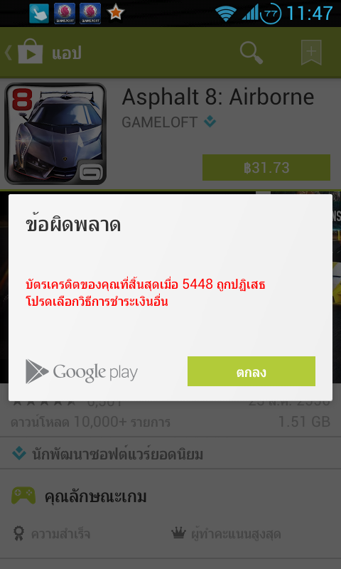 เมี่อช่วงต้นเดือนก็ยังซื้อapp game ได้ปกติ แต่เมื่อวานนื้กลับซื้อ game asphalt8 ไม่ด้ซะงั้น โดยมันขึ้นตามรูปเลยครับ
