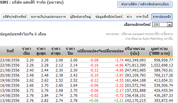 SIRI ลงติดต่อกัน 8 วันทำการตั้งแต่งบ Q2'56 ออก และ 7 วันทำการหลังสุด ลงไม่ต่ำกว่า 2% ทุกวัน