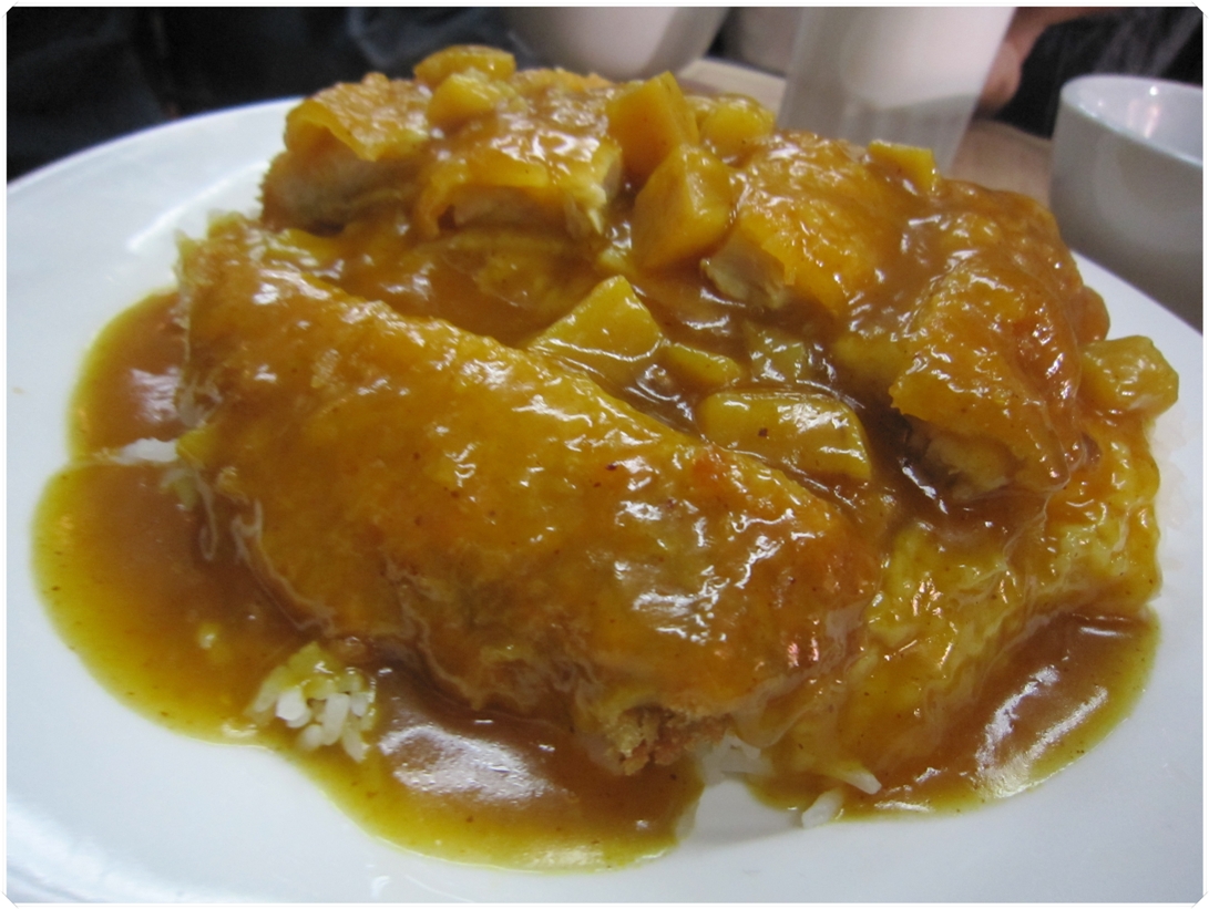 แกงกะหรี่ของร้านนี้ รสชาติไม่ได้เข้มข้น เหมือนที่เราคุ้นๆ กัน แล้วก็ไม่ได้มีกลิ่นของเครื่องเทศแรงๆ เหมือนฝั่งอินเดีย จะว่าไม่อร่อยก็ไม่ใช่ จะว่าอร่อยก็ไม่เชิง เอาเป็นว่า ก็ถือว่าใช้ได้ก็แล้วกัน แปลกๆ ดี --- ส่วนตัวหมูทอดเอง ก็ถือว่าผ่านนะ คือ ทอดได้ไม่เหนียว กรอบๆ กำลังดี ทานกับแกงกะหรี่ ก็โอเคอยู่นะสำหรับจานนี้