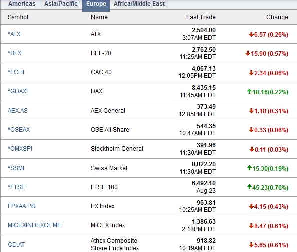 ตลาดหุ้นนิวยอร์กปิดลบเมื่อคืนนี้ (26 สิงหาคม 2556) ดัชนีเฉลี่ยอุตสาหกรรมดาวโจนส์ปิดที่ 14,946.46 จุด ลดลง 64.05 จุด หรือ -0.43% ดัชนี S&P500 ปิดที่ 1,656.78 จุด ลดลง 6.72 จุด หรือ -0.40% ดัชนี NASDAQ ปิดที่ 3,657.57 จุด ลดลง 0.22 จุด หรือ -0.01%