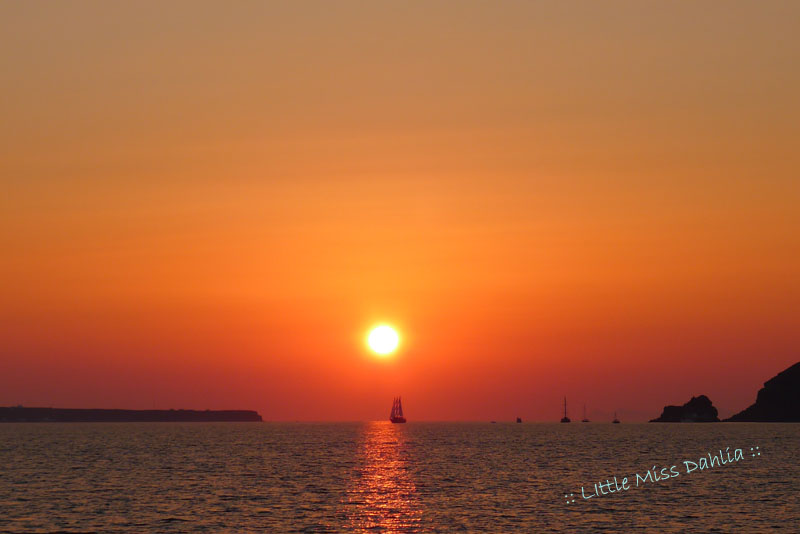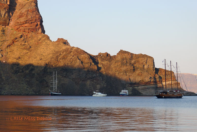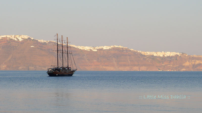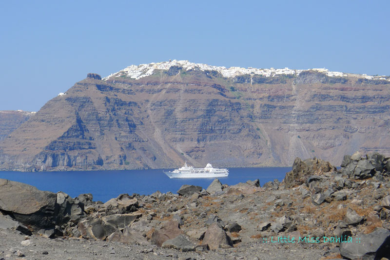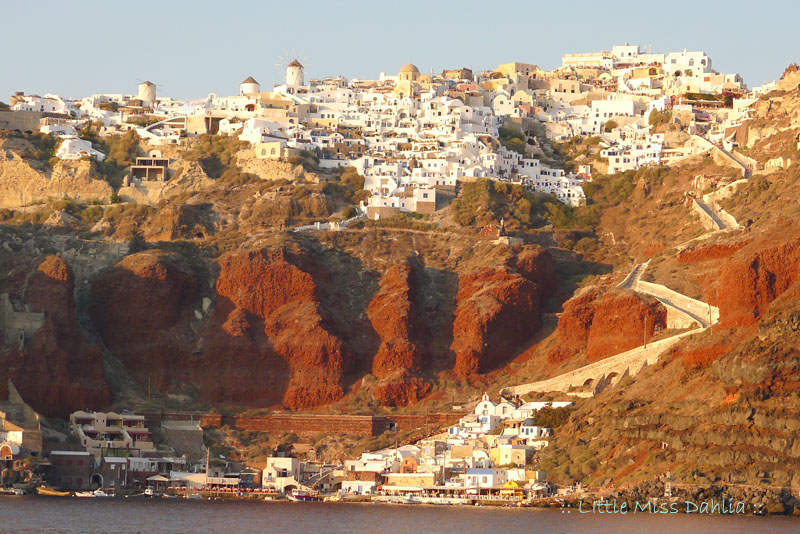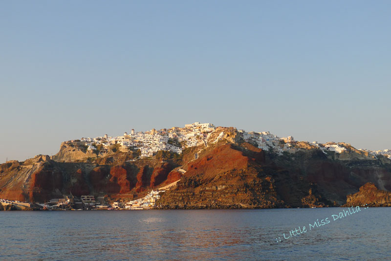 เรือยังคงเคลื่อนตัวต่อไป เราเห็นเป้าหมายสุดท้ายของทริปนี้แล้ว(จากไกลๆ) เมืองเอีย(Oia)ยามเย็นนี่ช่างสวยงาม ดวงอาทิตย์ที่กำลังเคลื่อนตัวต่ำลงทำแสงแดดสะท้อนไปยังตัวเกาะ บ้านเรือนสีขาวๆเริ่มกลายเป็นสีส้มอิฐเช่นเดียวกับสีพื้น Caldera