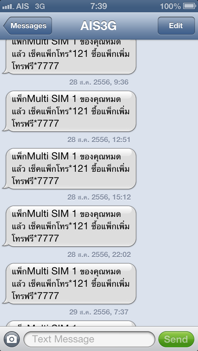 นี่ใช้ไปราวๆ 1 gb กว่าๆใช้ผ่าน sim หลักซะส่วนใหญ่ด้วยนะฮะ คือหักจาก multisim ก่อน ละก้ค่อยหักจาก sim หลักถูกมะฮะ แล้วที่กระหน่ำส่ง sms มาให้แบบนี้ทั้งวันคือผมแพคเกจหมดแล้วหรอฮะ ไม่สามารถใช้ได้แล้วหรืออย่างไรคือแพคหลักยังเหลืออีก 2.9 gb หนะครับเห็นแล้วเพลีย