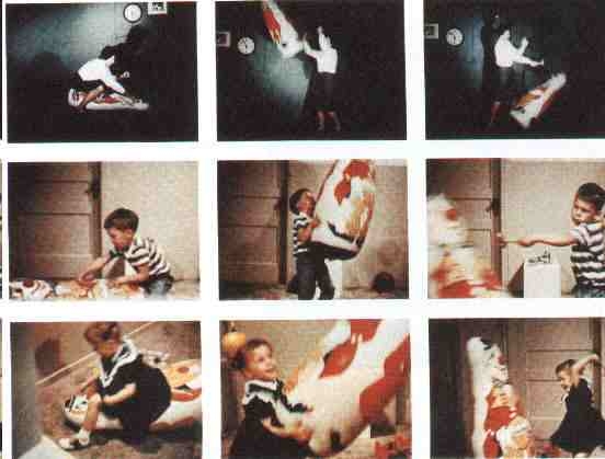 เมื่อเข้าไปในห้องแล้ว เด็กกลุ่มแรกตรงเข้าไปทำร้ายตุ๊กตาล้มลุกทันที บ้างก็เข้าไปใช้ค้อนตีแบบที่เห็นในวิดีโอ ในขณะที่มีเด็กบางคนเอาปืนของเล่นมาจ่อที่ตุ๊กตาด้วย ทั้งๆ ที่ในวิดีโอไม่ได้มีการใช้ปืนเลยแม้แต่น้อย ส่วนเด็กกลุ่มที่สองก็เข้าไปต่อยเตะตุ๊กตาเช่นกัน แต่ไม่ทำรุนแรงอย่างเด็กกลุ่มที่ได้ดูวิดีโอที่มีคนสาธิตตัวอย่างการทำร้ายหุ่นให้ดู