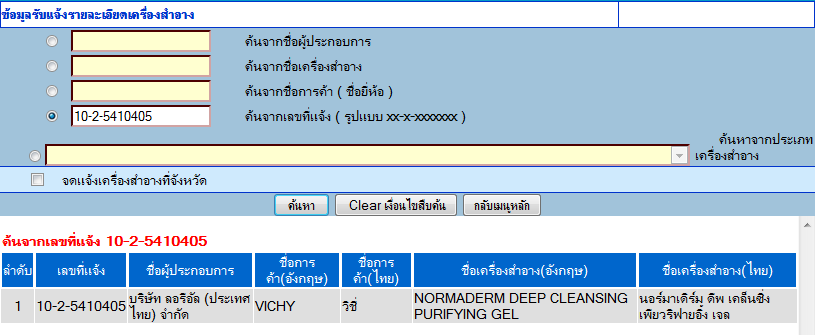 1) เข้าไปที่เว็ปไซต์นี้เลยค่ะ แนะนำว่าไม่ควรเข้าจาก Google Chrome นะคะ เข้าจาก Firefox หรือ IE จะสะดวกกว่าค่ะhttp://wwwapp1.fda.moph.go.th/logistics/cosmetic/CSerch.asp?id=cos&rad_status=0&consumer=0