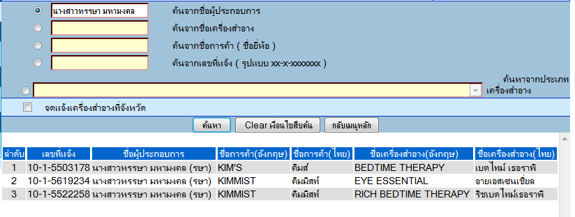 5) เราสามารถนำชื่อเจ้าของผลิตภัณฑ์มาเสิร์จหาได้ด้วยเช่นเดียวกัน จะแสดงถึงผลิตภัณฑ์ทั้งหมดที่เค้าผลิต