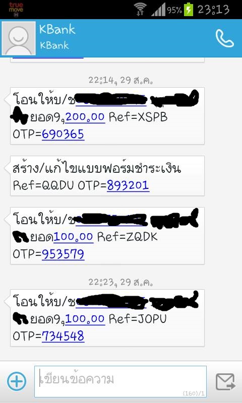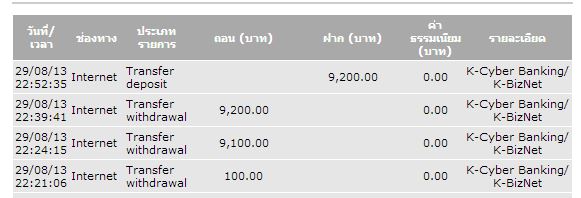 ผมใช้ k-cyber มาก็หลายปี วันนี้ ล่าสุดตอนสี่ทุ่ม กว่าๆ ทำการโอนเงินเข้า บัญชีคนอื่นในธนาคารเดียวกัน ซึ่งเคยเพิ่มบัญชีไว้แล้วเพราะติดต่อค้าขายกัน ผมทำรายการโอนแบบทันที 9200 บาท ก็มีระบบส่ง sms รหัส otp มาตามปกติ กรอกเสร็จ ก็ยืนยันตกลง ขึ้นรายการว่าโอนเรียบร้อย แต่ผมเช็คเงินไม่โดนตัด เช็ครายการเคลื่อนไหวล่าสุด ก็ไม่มีรายการนี้ ผมโทรถามคนที่ผมโอนเงินก็ไม่เห็นมีเงินโอนเข้า เลยลองใหม่อีกรอบ โดยลองโอนเงินไป 100 นึงบัญชีเดิม แบบโอนทันที เงินก็เข้าปุ๊บมีเมสเสจส่งไปยังผู้รับทันที ผมก็ งง ว่าทำไมตะกี้มันโอนไม่ได้