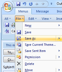 if you are using Outlook 2007 and have not Classic Menu for Office, please click the Office Button on the top-left and select "Save As".