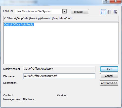 Step 9: Select "User Templates in File System" on the right of "Look In", the template "Out of Office AutoReply" which you saved will b