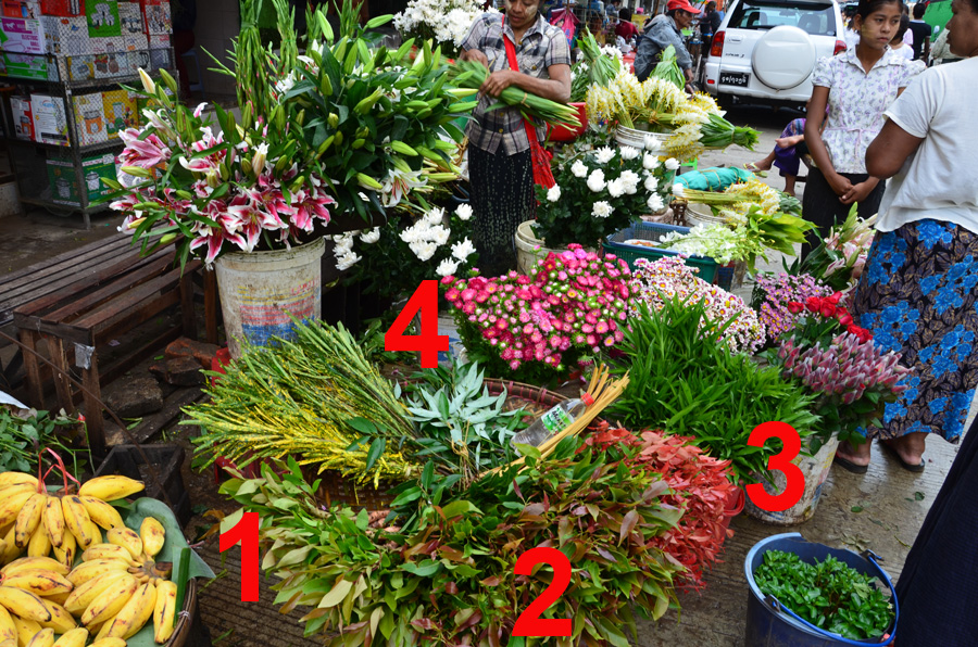 เดินผ่านร้านขายดอกไม้ในเมืองย่างกุ้งประเทศพม่า เห็นดอกไม้สารพัด จำได้ว่าผมเคยไปไหว้พระที่เมืองมัณฑะเลย์ แล้วเจ้าหน้าที่ชาวพม่าบอกว่า ชาวพม่าจะบูชาใบนี้กันเวลาไปไหว้พระ จังหวะมาเจอร้านขายดอกไม้พอดี เลยขอถามเลยละกัน
