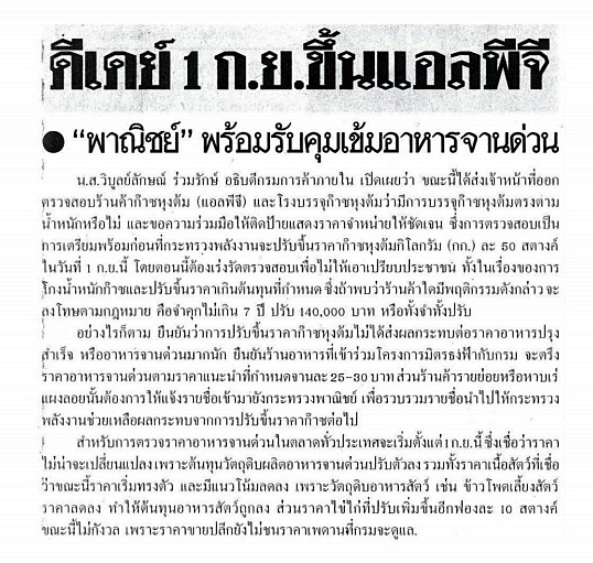 พาณิชย์ สั่งห้ามปรับราคาอาหาร หลังรัฐบาลขึ้นราคา LPG