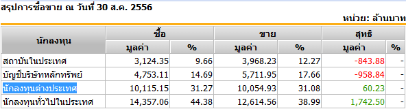 Sinthorn Summary 30/8/2556 : ต่างชาติซื้อสุทธิ 60.23 ลบ.