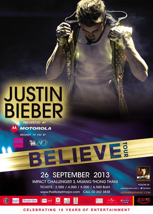 ซุเปอร์สตาร์ขวัญใจวัยทีนทั่วโลก จัสติน บีเบอร์ เตรียมเดินทางมาเปิดการแสดงในประเทศไทเป็นครั้งแรก หลังจากปล่อยให้แฟนคลับชาวไทยนั้นรอนานกับ คอนเสิร์ต จัสติน บีเบอร์-บีลีฟ ทัวร์ 2013 ในวันพฤหัสที่ 26 กันยายนนี้ ที่อิมแพ็ค ชาเลนเจอร์3 เมืองทองธานี โดยตามตรางการทัวร์นั้น ประเทศไทยจะเป็นประเทศแรกในเอเชีย ต่อจากการทัสร์ในสหรัฐอเมริกา ซึ่งเปิดจำหน่ายบัตรแล้วตั้งแต่วันนี้เป็นต้นไป