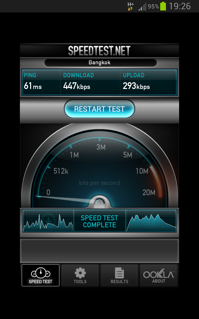 เลยมาแบ่งปันครับ สัญญาณไม่ดีนัก มีสองขีด ได้ความเร็วเท่านี้ครับ ประมาณ 384k เนื่องจากเป็น net แบบรายชั่วโมง ตามที่ feedback แจ้งด้านล่าง
