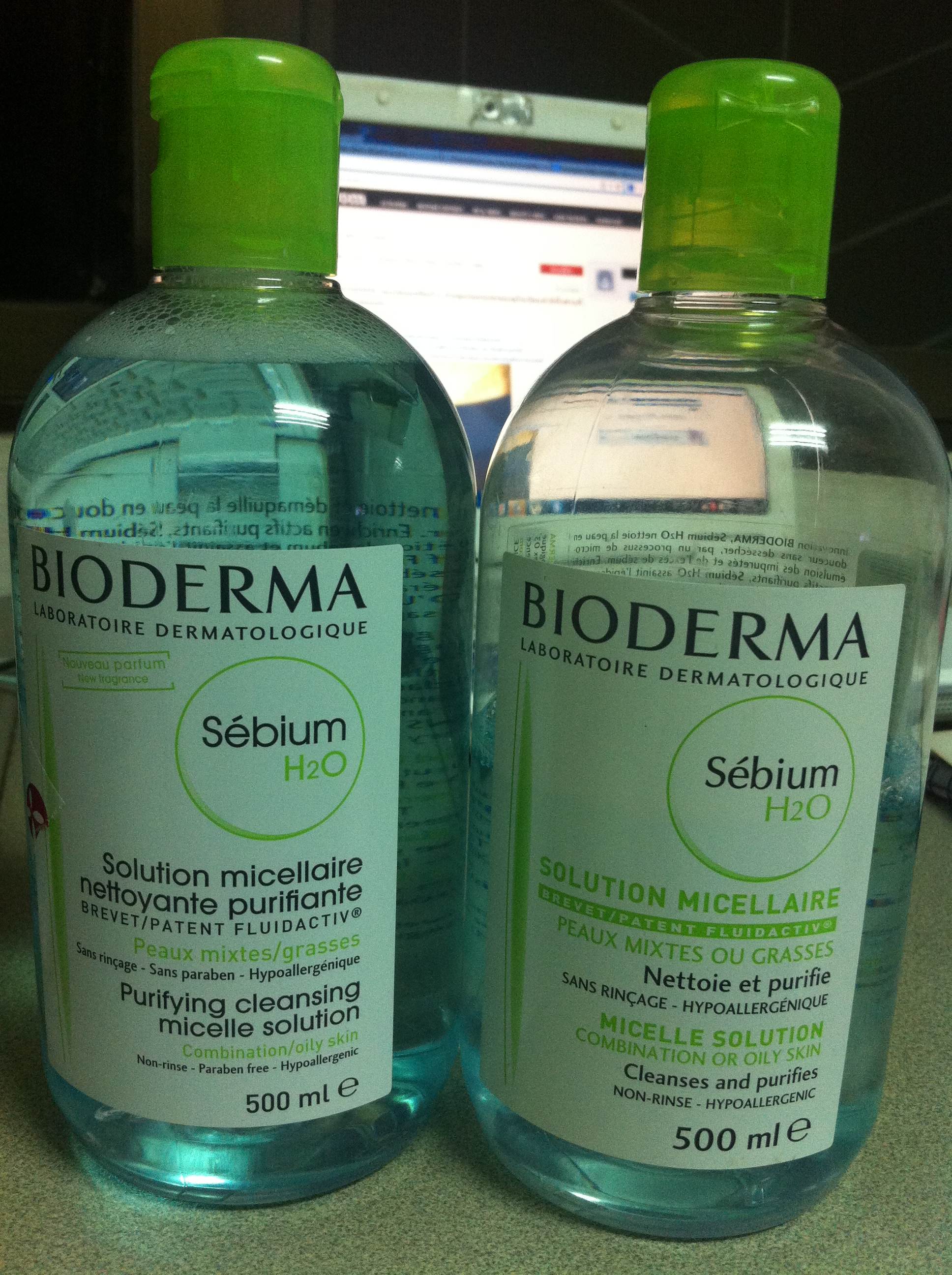 พอดีว่าฝากน้องที่ทำงานหิ้ว Bioderma มา 2 ขวดจากฮ่องกง แต่พอได้ของมามันมีข้อแตกต่างอยู่บ้างจากตัวเดิมที่ใช้อยู่ ในรูปซ้ายเป็นขวดที่ใช้อยู่ปัจจุบันใกล้หมดแล้ว (ซื้อที่วัตสัน) ตัวหนังสือสีเขียวซะส่วนใหญ่