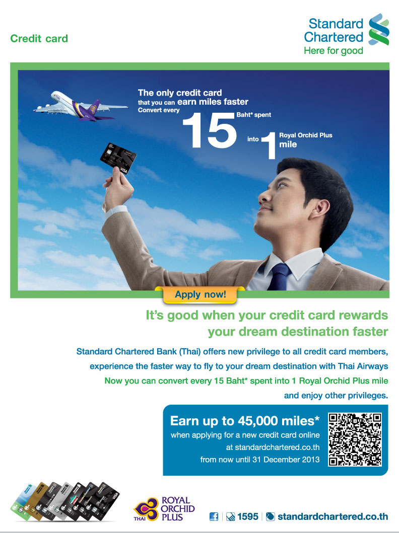 สุดยอดบัตรเครดิตแลกไมล์ของไทยมาแล้วครับ บัตรเครดิตสแตนดาร์ด ชาร์ตเตอร์ แค่ 15 บาทได้ 1 ROP ครับ ไม่จำเป็นต้องเป็นบัตรร่วมการบินไทย ไม่ต้องเสียค่ารายปี ได้ไมล์เร็ววววววว กว่าบัตรอื่นๆ ที่ร่วมกับการบินไ