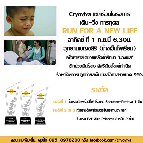 ร่วมเดิ่น-วิ่งการกุศล วิงวอนขอความช่วยเหลือเพื่อต่อชีวิตให้ 'น้องเบส' หายขาดจากโรคธาลัสซีเมีย