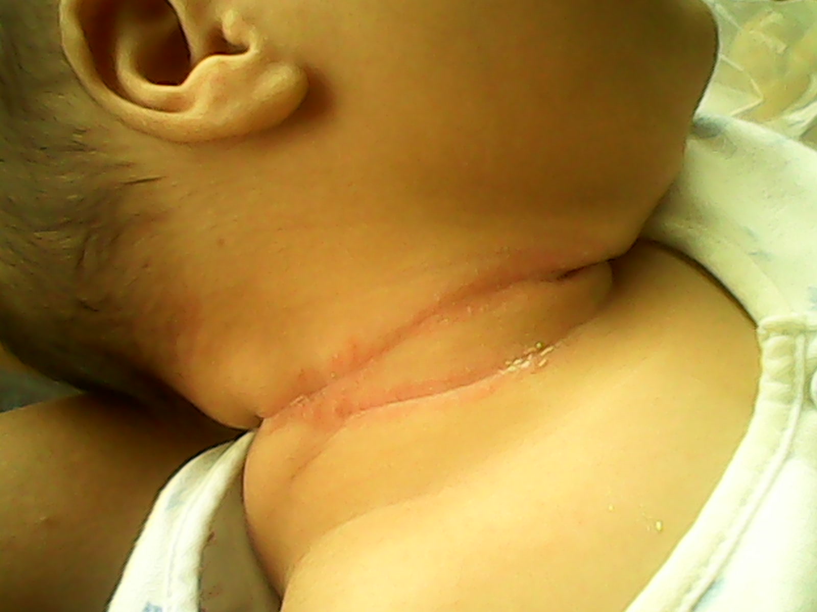 ลูกเป็นรอยพับตรงคอแดงมากค่ะ บางครั้งถึงกับเลือดออกซิบๆ ใครพอจะแนะนำวิธีรักษาให้บ้างคะ? (มีภาพประกอบ)