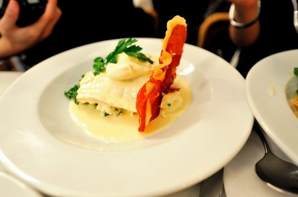 ปลารมควันบนมันบดที่ผสมกับใบคะน้า ไข่ลวก แฮม ในซอสแชมเปญ เข้ากันได้ดีมาก