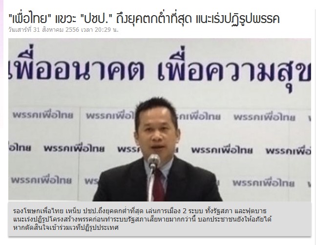 “วันนี้พรรคประชาธิปัตย์ ถือว่าอยู่ในยุคที่ตกต่ำที่สุดแล้ว เพื่อไทยอยากเห็นแนวทางใหม่ของพรรคประชาธิปัตย์ ที่ลุกขึ้นมาต่อสู้เพื่อเป็นทางเลือกให้ประชาชนด้วยวิธีที่สร้างสรรค์ มากกว่ามุ่งเล่นการเมือง 2 ระบบ คือระบบรัฐสภา และระบบฟุตบาธ อย่างการอภิปรายร่างแก้ไขรัฐธรรมนูญ ก็พยายามยื้อ ตีรวน ใช้แท็คติกประท้วงซ้อนประท้วง ใช้เวลามาเป็นสัปดาห์จนทำให้ระบบรัฐสภาเสียหาย จึงขอเอาใจช่วยให้ประชาธิปัตย์ปรับปรุงโครงสร้างพรรคให้สำเร็จ เพื่อทำตัวให้เป็นที่หวังได้ และไม่ทำให้ระบบรัฐสภาเสียหายไปมากกว่านี้”
