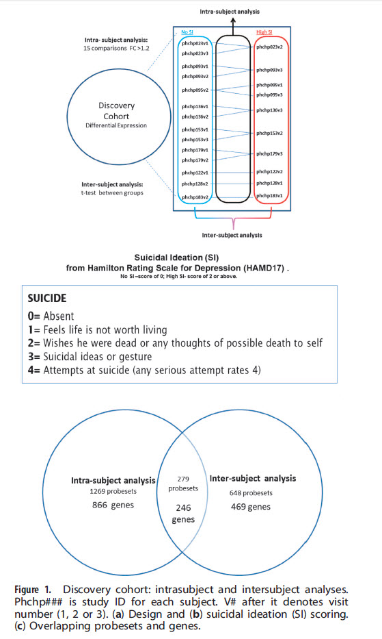 หลังจากศึกษาข้อมูลเดิมแล้วจึงทำการค้นหายีนที่สร้างตัวบ่งชี้ทางชีวภาพในเลือดที่จะสร้างเมื่อจะฆ่าตัวตายโดยมองหาการแสดงออกที่ต่างกันของยีนจากเลือดของผู้ป่วยที่อยู่ในกลุ่มตัวอย่างทั้งหมด เริ่มต้นจากหายีนที่เกี่ยวข้องทั้งหมด แล้วหาว่ายีนใดส่งผลต่อระดับความคิดที่จะฆ่าตัวตาย (suicidal ideation: SI) มากหรือน้อยโดยใช้การวิเคราะห์ด้วยวิธี intrasubject and intersubject analyses ซึ่งพบว่ามี 246 ยีนที่เกี่ยวข้อง