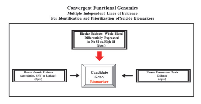 ลำดับถัดไปเพื่อการระบุและจัดลำดับความสำคัญของยีนทั้งหมดที่ได้จากตัวอย่างเลือดจากการทดลองก่อนหน้านี้ นักวิจัยจึงใช้ Convergent Functional Genomic (CFG) ในการวิเคราะห์และใช้ข้อมูลจากการชันสูตรสมองของผู้ป่วยที่เสียชีวิตไปแล้ว(ไม่เกิน 24 ชั่วโมง) รวมถึงข้อมูลทางพันธุกรรม ผลจากการทำ CFG พบว่ายีน SAT1, FOXN3, PIK3R5 และ GBP1 ส่งผลต่อการฆ่าตัวตายมากที่สุด แต่ค่าที่ได้จากการทำ CFG นั้นเป็นค่ากว้างๆ ยังไม่เฉพาะชี้ชัดได้มากพอ ดังนั้นนักวิจัยจึงใช้วิธีของ Bayesian เพื่อหาตัวบ่งชี้ทางชีวภาพที่ส่งผลโดยตรง พร้อมทั้งระบุความสำคัญของยีนดังกล่าวโดยลดค่า false-positive และ false-negative ที่เกิดขึ้นในตัวแต่ละบุคคลลง