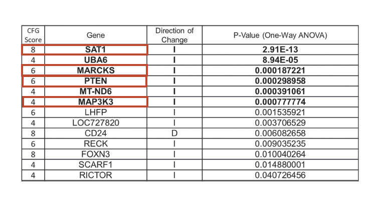 จากการใช้หลักของ Bayesian วิเคราะห์ข้อมูลทำให้พบว่า SAT1 (spermidine/spermine N1-acetyltransferase 1) มีความสำคัญมากที่สุด ส่งผลต่อการฆ่าตัวตายมากที่สุด ไม่ว่าจะใช้การวิเคราะห์ด้วยวิธีใดก็ตาม ในขณะที่ CD24 (small cell lung carcinoma cluster 4 antigen) ช่วยลดค่า SI ได้มากที่สุด