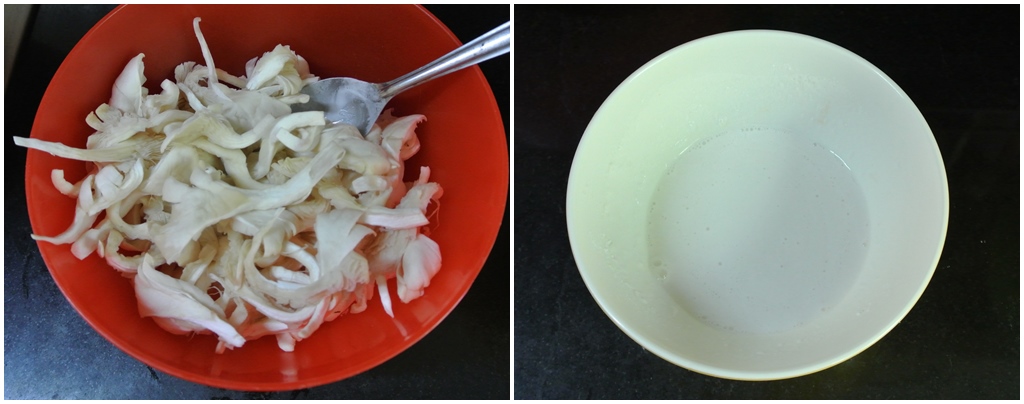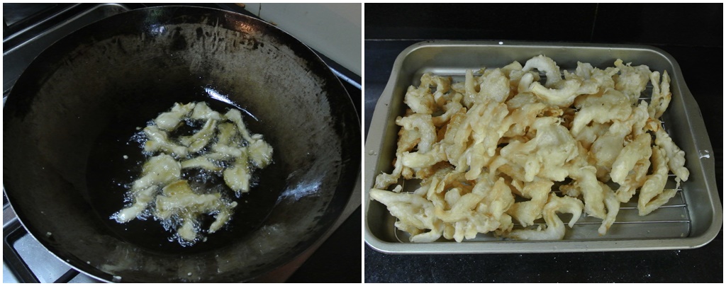 เห็ดนางฟ้าฉีกเป็นชิ้นเล็ก นำไปชุบแป้งทอด