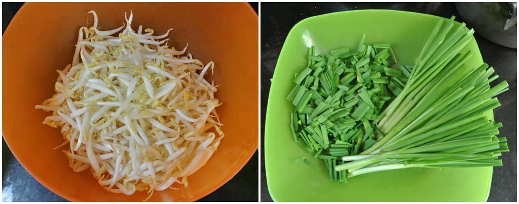 ใส่เห็ดทอดลงไปผัด ตามด้วย ถั่วงอกและใบกุยช่าย