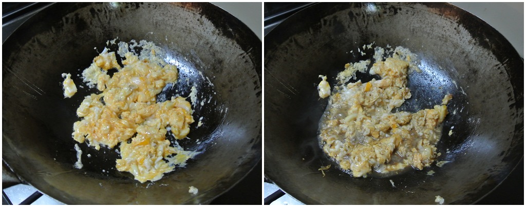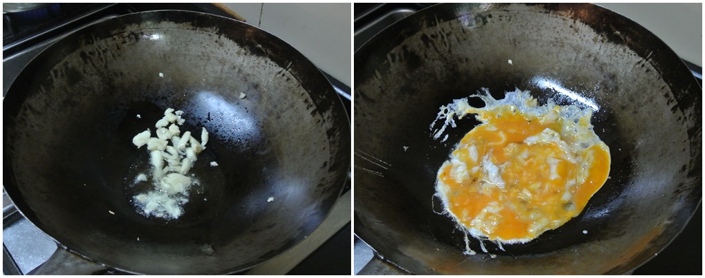 ตั้งกระทะใส่น้ำมันพืช เอากระเทียมลงไปผัด พอกระเทียมสุกใส่ไข่เป็ดลงไป