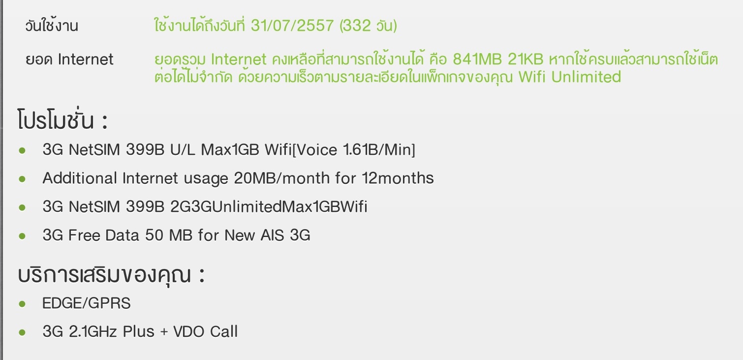 ใช้แพ็ค 399 ได้ 3G 1gig ครับ ตั้งแต่เริ่มรอบบิลผมปิด 3g เป็นส่วนใหญ่ อยู่ๆได้รับ sms ว่าใช้ 3g ครบแล้ว ก็งงสิครับ เลยเช็คดูดาต้าก็ใช้ไป 1gig จริงครับ แต่ 1 gig ที่ใช้ไปเนี่ยเป็น 3g ไม่ถึง 500 mb ซะ ด้
