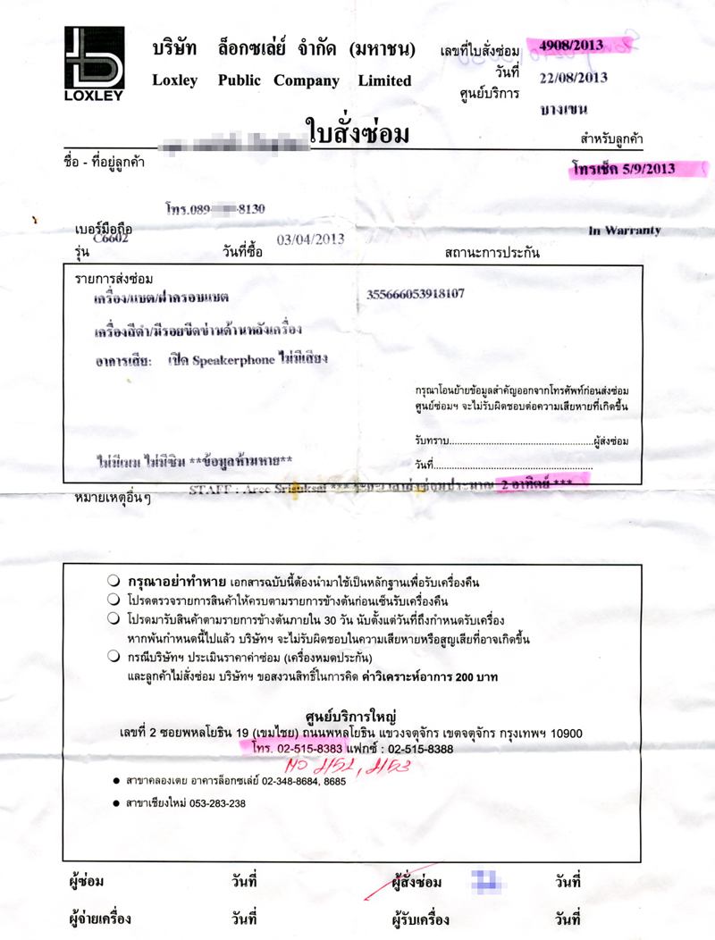 แล้ว Loxley ให้โทรเข้าหา Xperia Call Center 02-401-3030 คุยกับเจ้าหน้าที่ ก็ บรา ๆ ๆ ๆ ๆ ๆ สรุปว่า เชื่อตามคำแจ้งของช่าง Loxley แต่จะส่งเรื่องให้ตรวจสอบ รอผลต่อไปแบบลม ๆ แล้ง ๆ ค่าซ่อมแค่ 5 ร้อยกว่าบาทไม่เท่าไร แต่จะมาตัดประกันกันเนี่ย รับไม่ได้ครับ