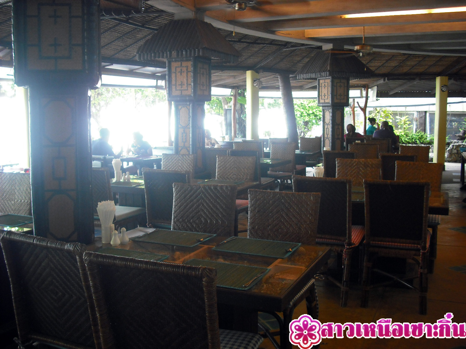 บุพเพ่ต์อาหารอยู่ด้านในนะค่ะ เขาเอาโต๊ะเก้าอี้ในช่วงดินเนอร์ออกมา ตอนเช้าเอามาตั้งเป็นเคาน์เตอร์วางถาดอาหาร