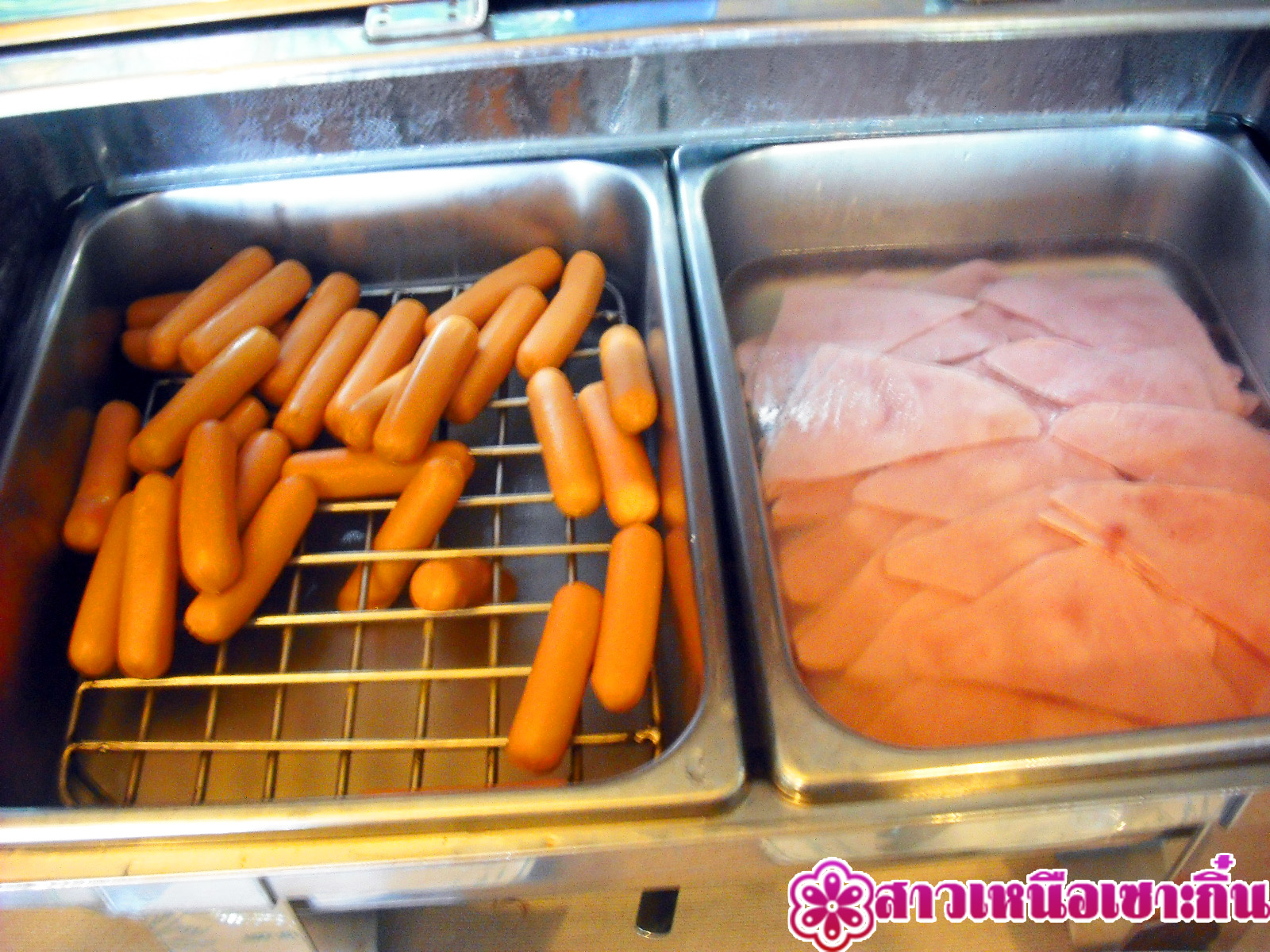 ถาดแฮมแช่ในน้ำอุ่น กับถาดไส้กรอก รสชาติใช้ได้ แฮมนิ่มดี ฉีกง่าย ไม่เหนียวหนืดเป็นยางมิชลิน