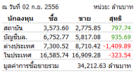 เว็บไซต์ตลาดหลักทรัพย์แห่งประเทศไทย รายงานสรุปการซื้อขายหลักทรัพย์ โดยแบ่ง ตามประเภทนักลงทุน ประจำวันที่ 15 มกราคม 2557 ดังนี้ กลุ่ม ปริมาณซื้อ % ปริมาณขาย % สุทธิ (ลบ.) (ลบ.) (ลบ.) นักลงทุนสถาบัน 2,