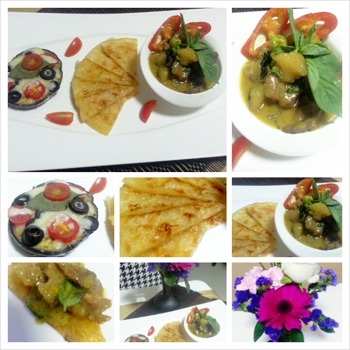 เมนูนี้ ผมนำเสนอในแบบ course set menu 3 ส่วนด้วยกันนะครับ มาเริ่มดูขั้นตอนกันดีกว่า วัตถุดิบหลักครับ ได้มะเขือม่วงจากโครงการหลวง ช่วงเช้าไปเดินเล่นที่ อตก. มา น้ำหลายไหลย้อย ของอร่อยเพียบ บ่ายมาจ่ายตลาดปากเกร็ด ได้ เนื้อสันนอกติดมันมา ได้การทำแกงเขียวหวานเนื้อแบบน้ำขลุกขลิกกินดีกว่า ขั้นแรกผม หั่นมะเขือม่วงออกเป็นแว่น ๆ จากนั้น เอามีดบั้งเป็นตาราง หมากฮอส แล้วทำการโรยเกลือป่น ให้ทั่วทั้งสองด้าน แล้วพักไว้ 20 นาที ระหว่างนั้น ทำการหั่น มะเขือเทศราชินี และ มะกอกดำ เป็นแว่น ๆ จัดการหั่นเนื้อให้เป็นชิ้นพอคำ ทำการตั้งกระทิ เพื่อเคี่ยวให้แตกมัน ผมใช้กระทิสำเร็จรูป อร่อยดี เพราะสะดวก (ขี้เกียจคั้นมือ) ใช้ไฟกลาง เคี่ยวจน กระทิข้น และ แตกมัน จากนั้นทำการผัดน้ำพริกแกง เลือกใช้น้ำพริกแกงเขียวหวานสำเร็จ (ไม่สะดวกตำ และประหยัดเวลา) วันนี้ผม ผัดพริกแกงกับเนย ได้ความหอมไปอีกแบบ เมื่อพริกแกงสุก ค่อย ๆ เติมกระทิและผัดไปเรื่อย ๆ จากนั้น ใส่เนื้อที่หั่นเตรียมไว้ลงไป รอจนเนื้อสุก ค่อย ๆ เติมกระทิ ไป เรื่อย ๆ จากนั้น ใส่มะเขือพวงลงไป และเคี่ยว ไปเรื่อย ๆ พอน้ำแกงเริ่มแห้ง ก็เติมกระทิลงไป พอได้ที่ ปรุงรส ด้วย น้ำปลา และ น้ำตาลปี๊ป ใส่ พริกชี้ฟ้าแดงลงไป ก่อนปิดเตา ใส่ใบโหระพา ที่เด็ดไว้ลงไป เป็นอันเสร็จ กลับมาดู มะเขือของเราครับ เกลือที่โรยไว้ จะเข้าไปขับ รสขม และความขื่นที่มีในมะเขือออกมา จะทำให้มะเขือรสชาดดีขึ้น จากนั้น นำไปล้างนำ และรอให้สะเด็ดน้ำ จากนั้นตั้ง กะทะ นำมะเขือไปย่างให้สุก โดยใส่น้ำมันมะกอกลงไป ตามตารางที่บั้งไว้ เพื่อช่วยเรื่องกลิ่น และรสสัมผัส ขั้นตอนนี้ สามารถนำมะเขือเข้าไปอบในเตา 1 ครั้งก่อน เพื่อให้สุกก็ได้ครับ เมื่อมะเขือสุกแล้ว โรย ออริกาโน่ ลงไป ตามด้วย การโรย มะกอกดำ มะเขือเทศ และมอสซาเรลล่า ชีส ลงไป นแล้วนำเข้าไปอบ จากนั้น ทำการโรยชีส และใส่ใบโหระพาลงไป ครับ นำเข้าไปอบอีกครั้ง เป็นอันเสร็จ ระหว่างนั้นเราก็มาจัดการกับ โรตี ครับ แหะ ๆ ยังทำไม่เป็น ก็ใช้แบบสำเร็จครับ แบบไม่ชอบโรตีอาบัง ผมเลือกของ ฮิปโป ครับ ตอนไปซื้อ จำได้ว่า เมื่อก่อน แพคเกจ จะเป็นกล่อง แต่ตอนนี้เปลี่ยนแพคเกจ และใช้ว่าแป้งเอนกประสงค์ ตอนแรก งง ๆ จะบอกว่า อร่อยมว๊าก ๆๆๆ ของเจ้านี้ นี่เป็นตัวแป้งครับ เวลาทอดอย่าเอาออกจากตู้นานครับ แป้งจะเหลว แกะยากนิดนึง ตั้งกะทะ ใส่เนยเค็มลงไป เอาแป้งโรตีวาง ลงไปเลยครับ แล้วกลับไปกลับมา แป้งจะขึ้นฟู หอมหวลมากช่วงนี้ ฟินสุด ๆๆ ครับ พอทอดโรตีเสร็จ มะเขือก็สุก ทุกอย่าง เป็นอันเสร็จ ก็นำมาจัดจานกั