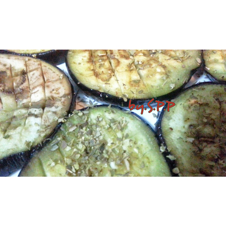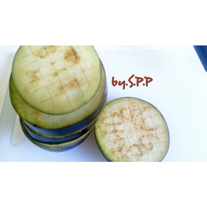 จากนั้นตั้ง กะทะ นำมะเขือไปย่างให้สุก โดยใส่น้ำมันมะกอกลงไป ตามตารางที่บั้งไว้ เพื่อช่วยเรื่องกลิ่น และรสสัมผัส