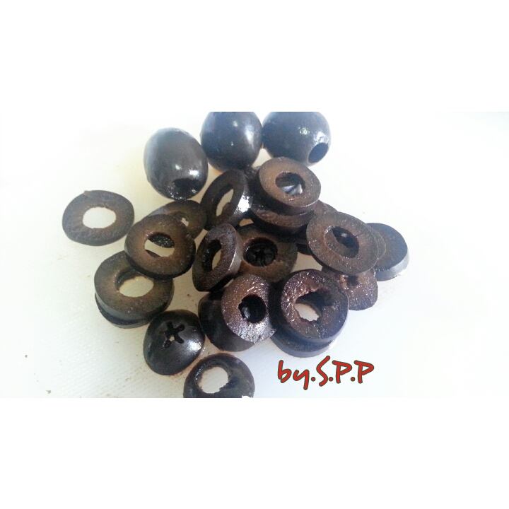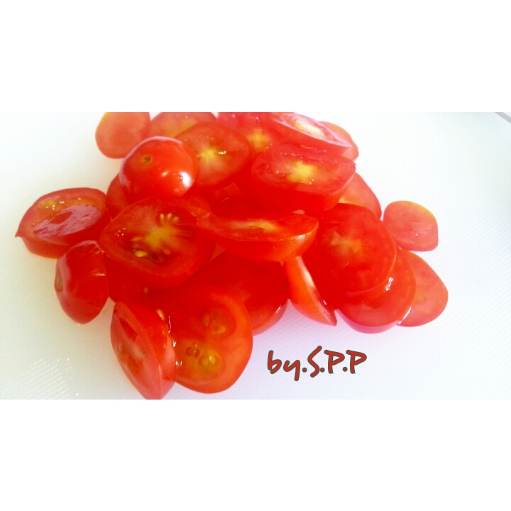 ระหว่างนั้น ทำการหั่น มะเขือเทศราชินี และ มะกอกดำ เป็นแว่น ๆ