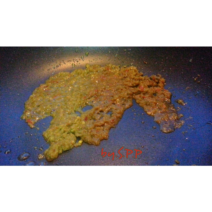 จากนั้นทำการผัดน้ำพริกแกง เลือกใช้น้ำพริกแกงเขียวหวานสำเร็จ (ไม่สะดวกตำ และประหยัดเวลา)