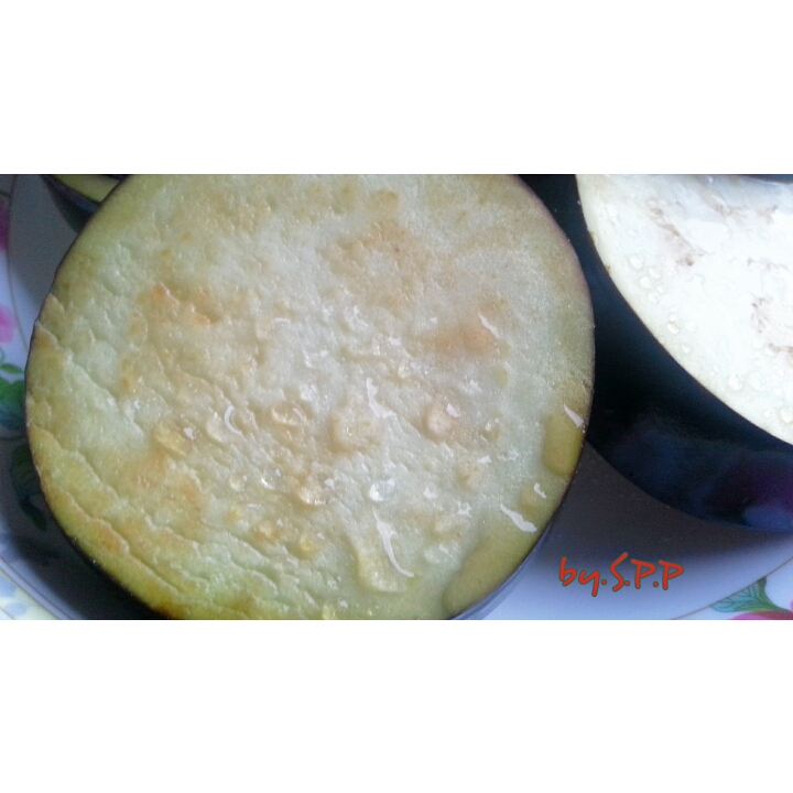 ขั้นแรกผม หั่นมะเขือม่วงออกเป็นแว่น ๆ