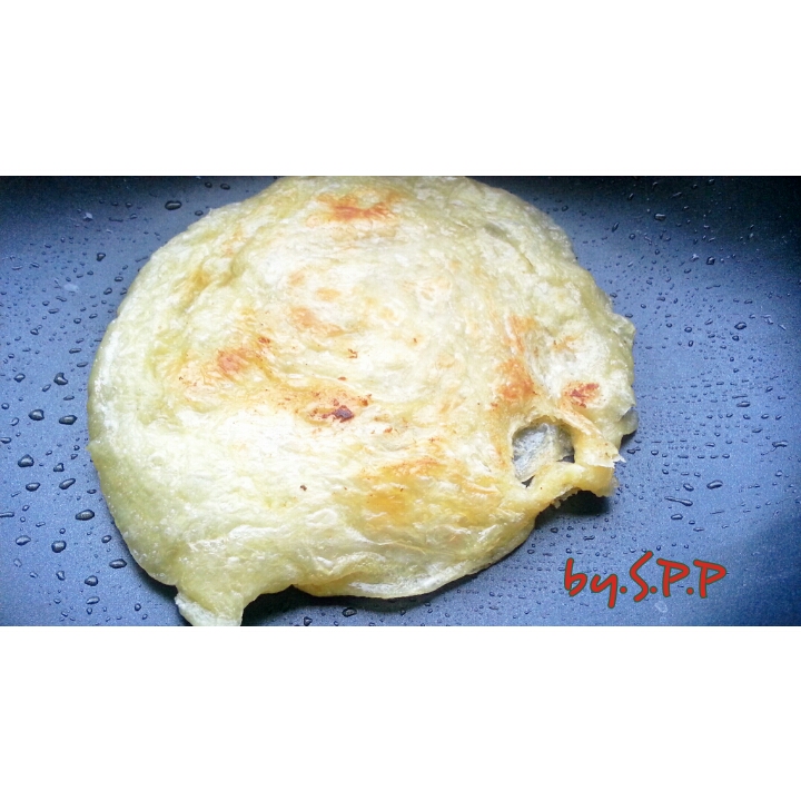 ตั้งกะทะ ใส่เนยเค็มลงไป เอาแป้งโรตีวาง ลงไปเลยครับ แล้วกลับไปกลับมา