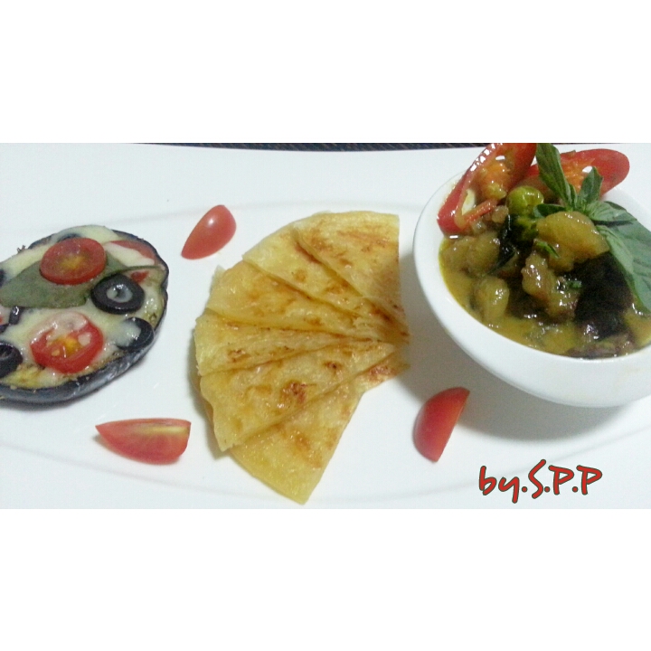 พอทอดโรตีเสร็จ มะเขือก็สุก ทุกอย่าง เป็นอันเสร็จ ก็นำมาจัดจานกันครับ เย้ ๆๆๆ จะได้กินแย้ววว