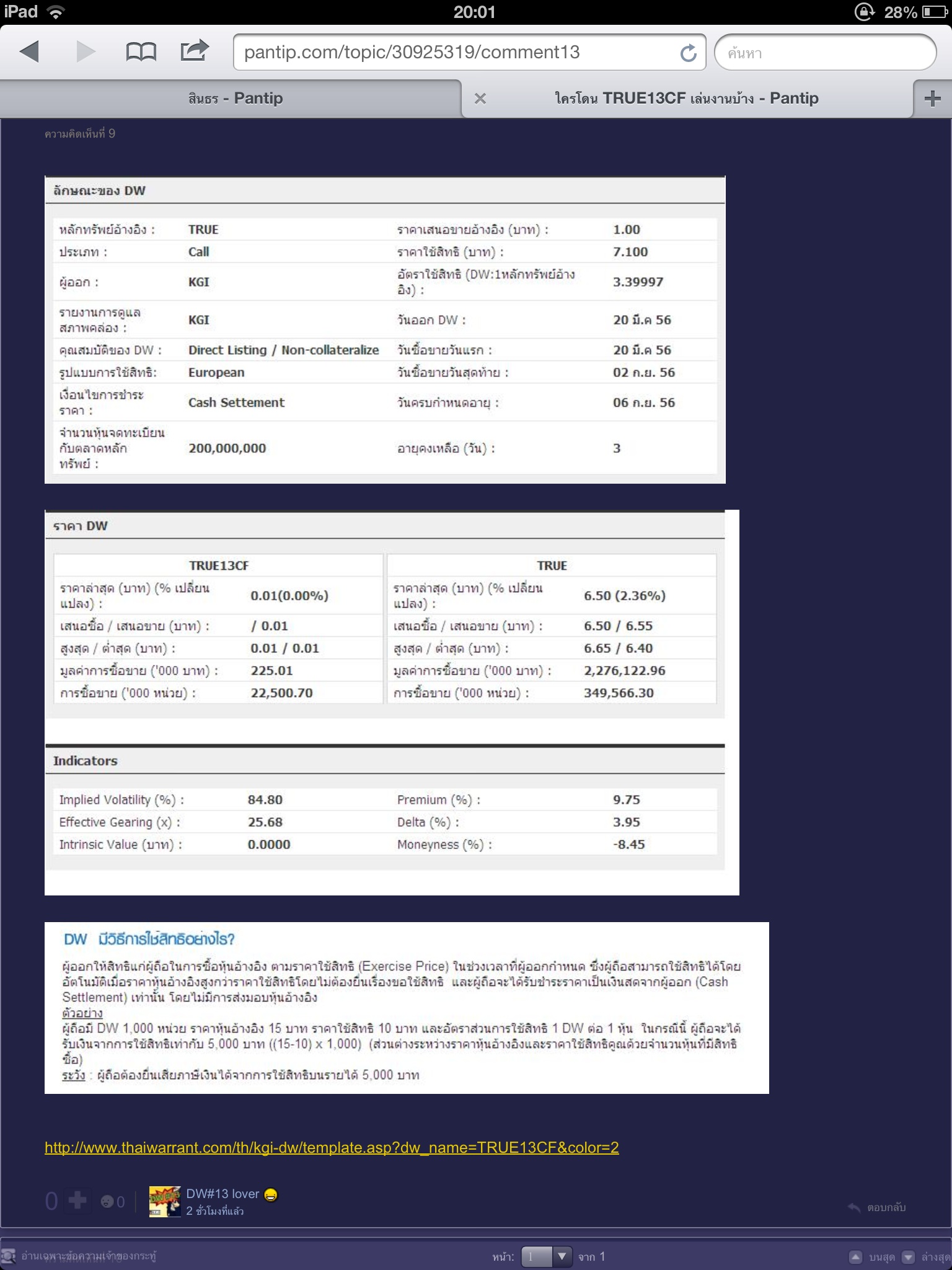 พอดีผมซื้อ DW ใว้ตัวนึงคือ TRUE13CF ซื้อขายวันสุดท้าย 02/09/2556 ราคาใช้สิทธิ 7.100 ตอนนี้ผมถือใว้ที่ราคา 0.08@1,000,000หุ้น ตอนนี้ราคาTRUE คือ 6.35 หากถึงวันที่หมดอายุ แล้วราคาทรูไม่ถึง 7.10 ผมยังม