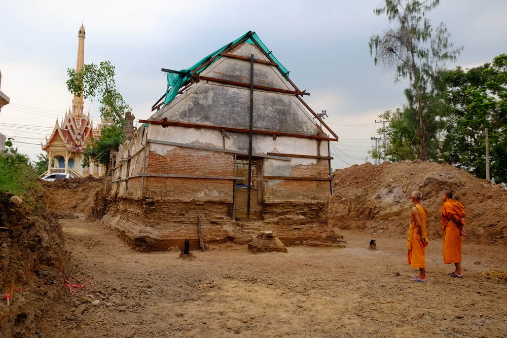 ขณะนี้กำลังขุด เพราะฐานโบสถ์เดิมอยู่ลึกลงไปจากผิวดินประมาณ 3 เมตร