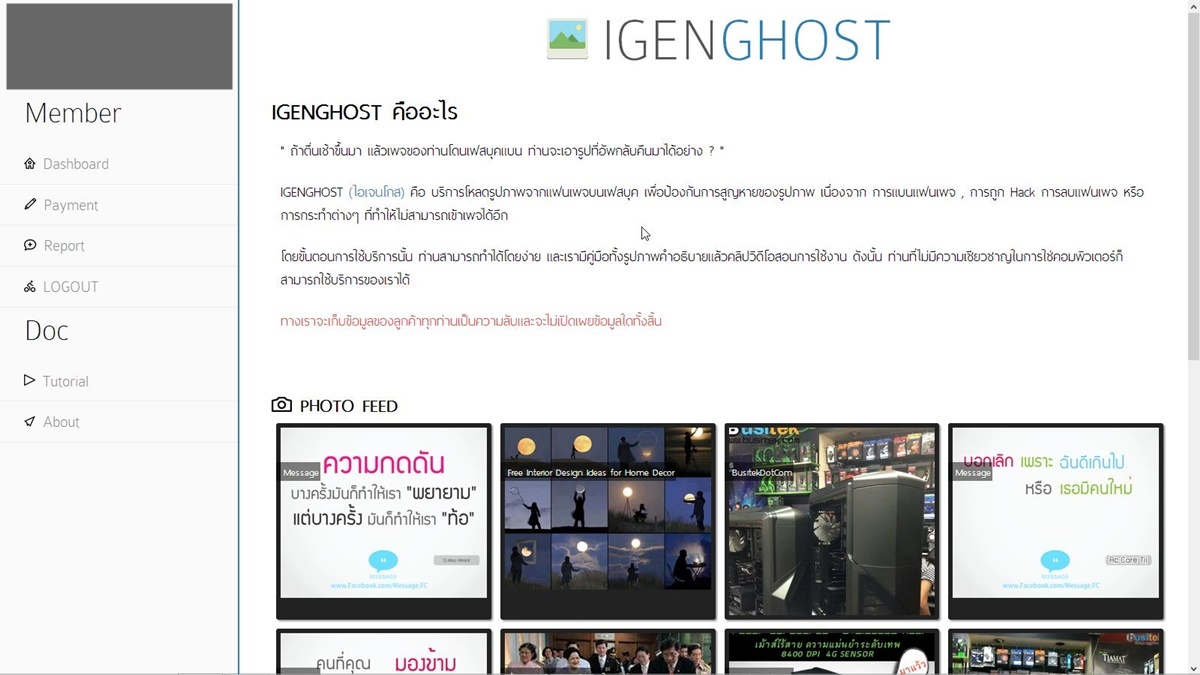 IGENGHOST (ไอเจนโกส) คือ บริการโหลดรูปภาพจากแฟนเพจบนเฟสบุค เพื่อป้องกันการสูญหายของรูปภาพ เนื่องจาก การแบนแฟนเพจ , การถูก Hack การลบแฟนเพจ หรือการกระทำต่างๆ ที่ทำให้ไม่สามารถเข้าเพจได้อีก