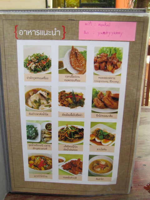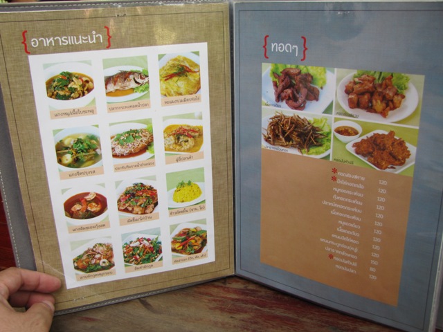 - เมื่อไปถึงแล้วก็จะมีน้องเอาเมนูมาให้ ขอชมเชยน้องๆที่บริการในร้านนี้ครับ เอาใจใส่ลูกค้าดีครับ ถึงแม้ว่าการสื่อสารอาจจะผิดพลาดไปบ้างแต่ก็แก้ปัญหาได้ดีพอสมควรครับ เห็นหน้าน้องๆตอนแรกเหมือนจะมึนๆ เลยกลัวว่าจะเป็นแบบร้านอาหารชื่อดังร้านอื่นที่ไม่ง้อลูกค้า แต่ผิดคาดครับ เรียกปุ๊บมาปั๊ป อันนี้ถือว่าเป็นเสน่ห์ที่นี่อย่างหนึ่งเลยครับ มาดูเมนูกัน อาหารที่ขึ้นชื่อของที่นี่ก็คือ “ยำผักกูด” กับ “ทอดมันหัวปลี” ครับ