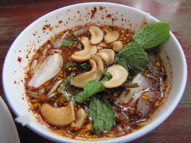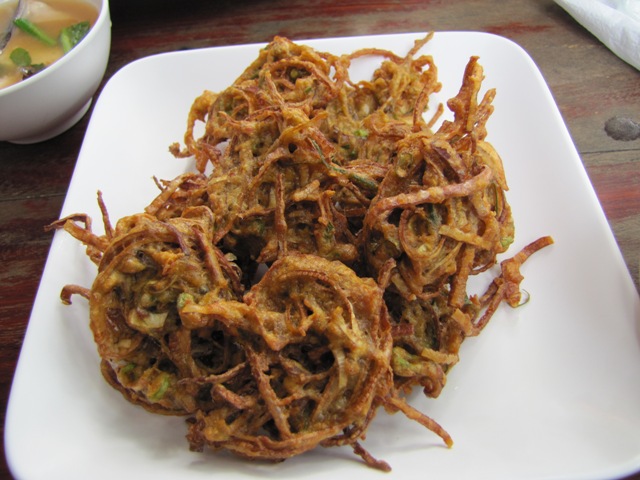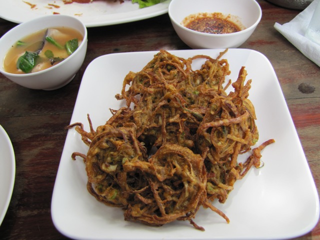 - นี่ก็เป็นหนึ่งในอาหารแนะนำที่นี่ครับ “ทอดมันหัวปลี” ทานดูแล้วเป็นอารมณ์ทอดมันจริงๆครับ คือมีกลิ่นของเครื่องแกงทอดมัน ไม่ใช่หัวปลีชุบแป้งทอดเฉยๆ เมนูนี้ก็จัดไป 2 จานครับ น้ำจิ้มจะคล้ายๆน้ำจิ้มเต้าหู้ทอดอ่ะครับ ประมาณน้ำมะขามเปียกเหนียวๆข้นๆ ใส่ถั่วป่น และพริกป่น (เผ็ดใช้ได้เลยครับ)