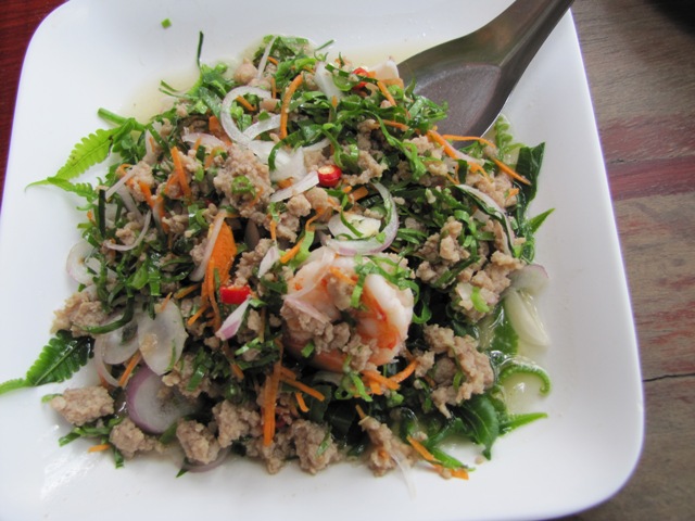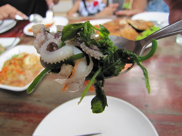 - มาแล้ว “ยำผักกูด” Signature ของที่นี่ รสจัดมากได้ใจภรรยาผมผู้ที่ชอบรสเปรี้ยว เป็นที่สุด รสชาติจะออกเปรี้ยว เค็ม หวาน พริกเขาจะซอยมานะครับไม่ได้ตำมา ส่วนผักกูดนั้นกรอบดีครับ ใส่กุ้งตัวค่อนข้างโต ปลาหมึก และหมูสับ อร่อยจนทำให้ต้องสั่งเพิ่มมาอีก 1 จาน ตั้งแต่ข้าวยังไม่มาครับ