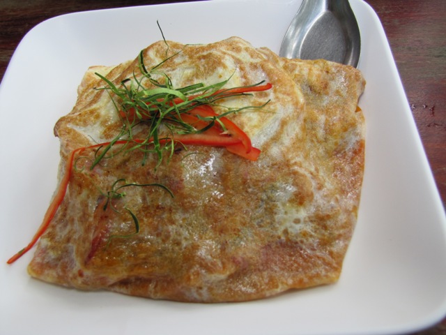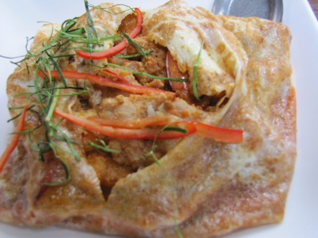 - เมนูต่อไปก็เป็น “พะแนงรวมมิตรห่อไข่” เป็นไข่ยัดไส้แกงพะแนงที่ใส่หมู, กุ้ง และปลาหมึก ครับ รสชาติจะออกหวานๆ เค็มๆ และเผ็ดพอสมควร