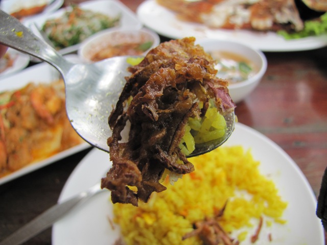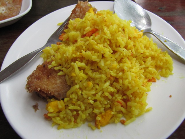 - ตอนแรกจะสั่งข้าวสวยมาทานกับอาหารที่สั่งไป แต่ที่นี่แนะนำ “ข้าวผัดขมิ้น” ครับ แนะนำมาก็จัดไป อารมณ์ก็ประมาณทานข้าวหมกต่างๆ ดีครับแปลกไปอีกแบบ ตอนนี้ก็มีเรื่องขำๆครับ คือเราสั่งเอาข้าวผัดขมิ้น 1 โถ และข้าวเปล่าให้ลูกสาว 1 จาน ผลปรากฏน้องเอาข้าวสวยมาให้ 1 โถ ข้าวผัด 1 จาน เรียกน้องอีกคนมาแก้ไขให้แกบ่นอีกแล้ว (“คนนี้อีกแล้ว ประจำเลย ไม่เคยจำ บลาๆๆๆๆๆๆๆๆๆ” เราก็ขำๆและน้องก็เอาไปเปลี่ยนเร็วดีครับ) อีกรูปเราก็มาดูทอดมันหัวปลีใกล้ๆ กันครับ